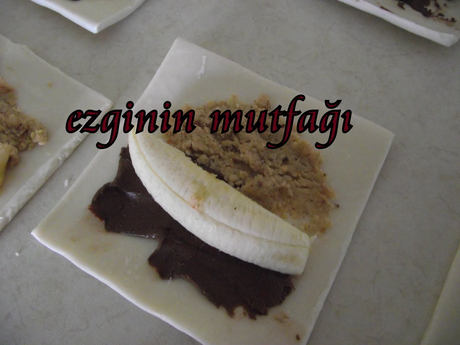 ÇİKOLATALI VE MUZLU MİLFÖYLERherbir milföy hamurunun bir yarısına fındık ezmesi diğer yarılarına nutella sürüp ortasına muz parçası koyup hamuru kapatıyoruz.üzerine yumurta sarısı sürüp hardal tohumu serpiyoruz.yağlı kağıt serili fırın tepsisine yerleştirip